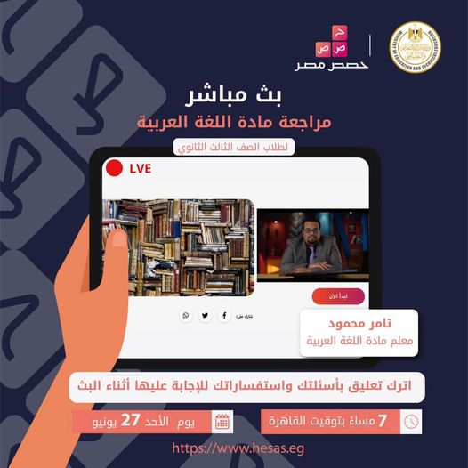 ٢٧ يونيو الساعة ٧ مساءً، عبر منصة حصص مصر والصفحة الرسمية للوزارة على الفيسبوك.