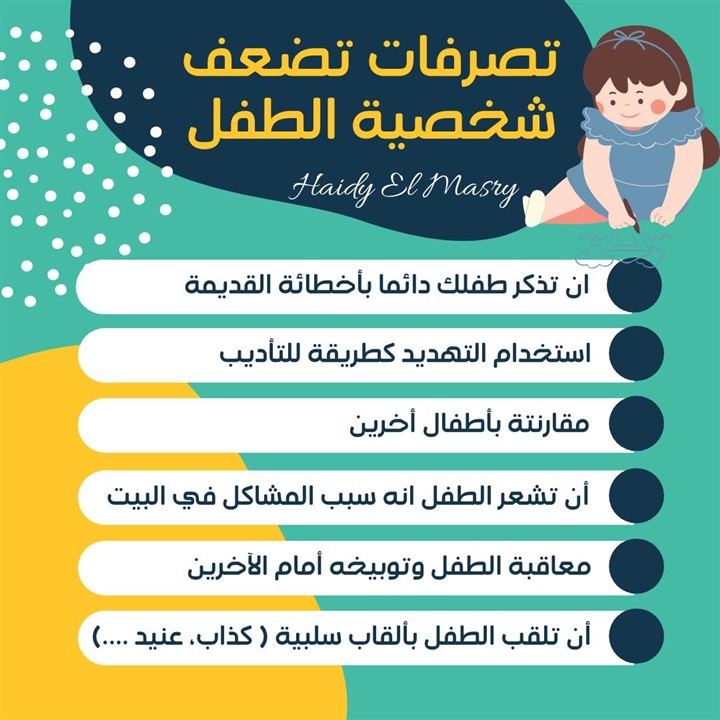 كشفت الدكتورة هايدي المصري، أخصائي تربية الأطفال، بمنشور عبر حسابها الرسمي على موقع التواصل الاجتماعي"فيسبوك" أسباب ضعف الشخصية عند الأطفال، وهم:
