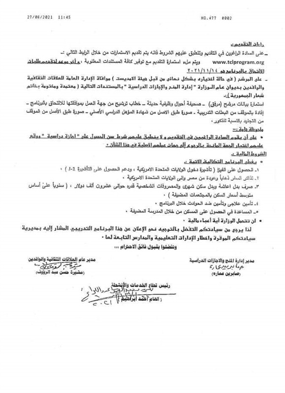 نص الخطاب، على أن الوزير وافق على الإعلان عن قيام هيئة الإميدست بالقاهرة بفتح باب التقديم للالتحاق ببرنامچ "معلمي اللغات المهمة TCLP " لمعلمى اللغة الإنجليزية أو العربية )كلغة أجنبية