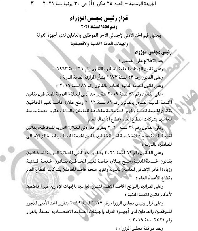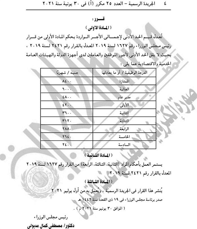 نشرت الجريدة الرسمية في عددها الصادر، الأربعاء، قرار تطبيق الحد الأدنى للأجور لموظفي الدولة، بدءا من غد الخميس، أول يوليو.