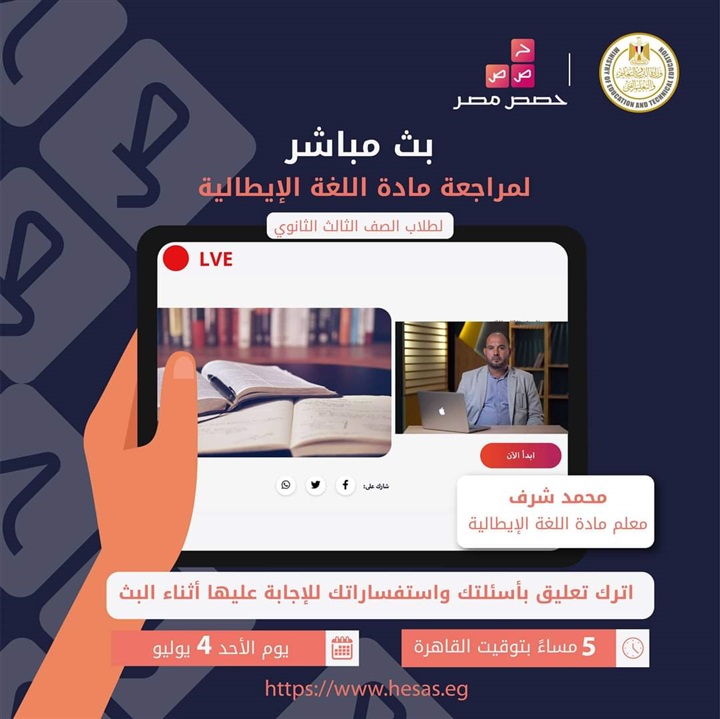 وأوضحت الوزارة أنه سيتم البث المباشر لمراجعة مادة اللغة الإيطالية عبر منصه حصص مصر والصفحة الرسمية لوزارة التربية والتعليم على موقع التواصل الاجتماعي" فيسبوك".