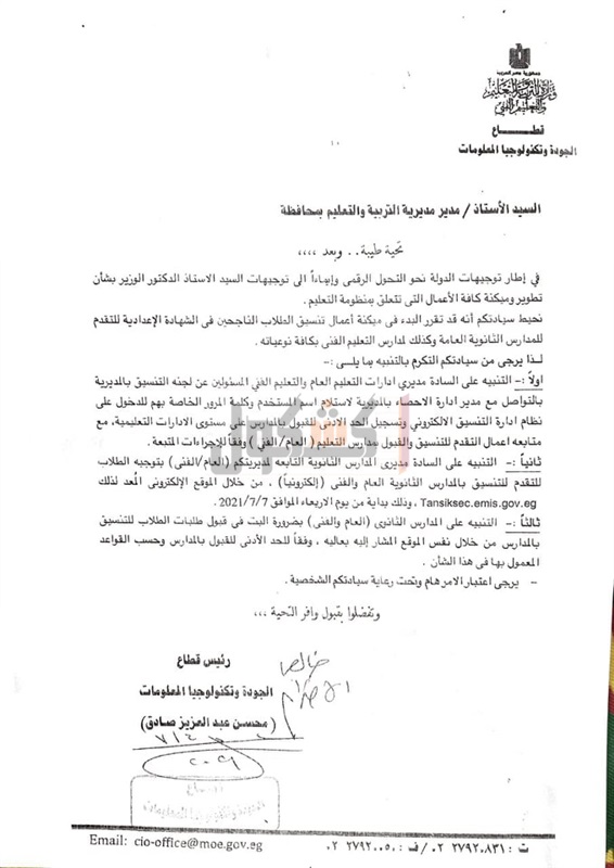 ثانيا: التنبيه على مديرى المدارس الثانوية التابعه لمديريتكم) العام /الفني (بتوجيه الطلاب التقدم للتنسيق بالمدارس الثانوية العام والفنى )إلكترونياً، من خلال الموقع الإلكتروني المعد لذلك، وذلك بداية من يوم الأربعاء الموافق 2021/7/7 .