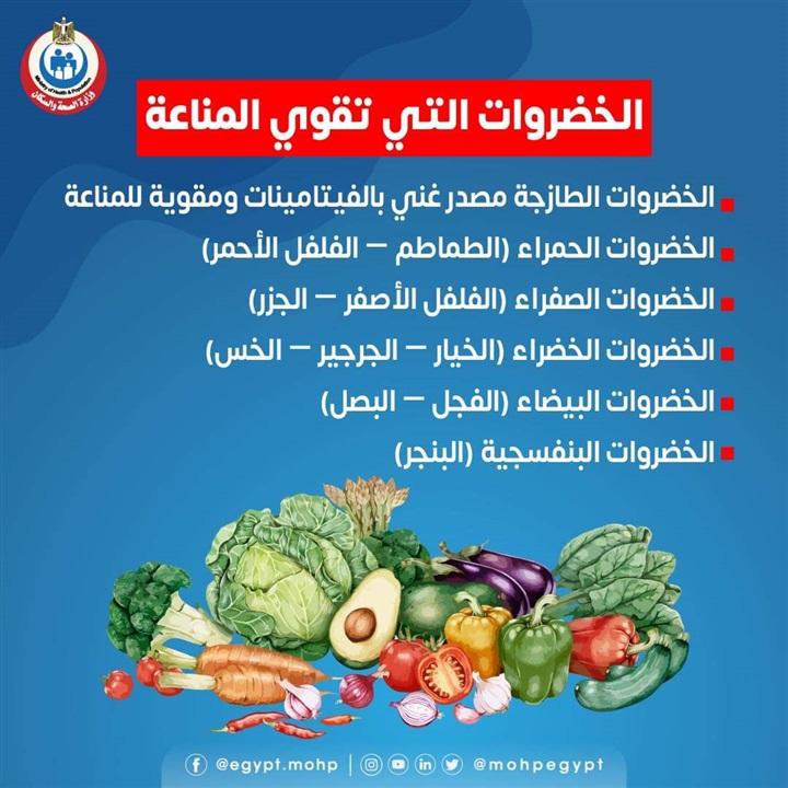 نصحت وزارة الصحة والسكان، بتناول الخضروات التي تقوي المناعة لمواجهة فيروس كورونا المستجد.