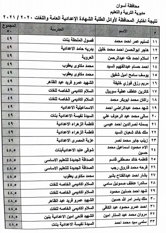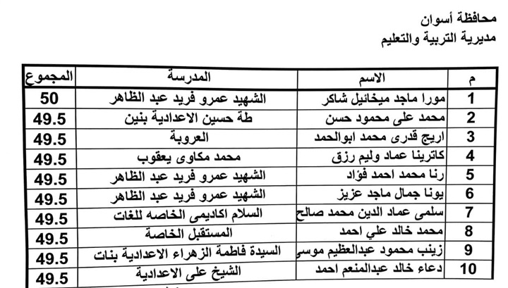 محافظ أسوان يعتمد نتيجة اختبارات أوائل الشهادة الإعدادية لقائمة الشرف