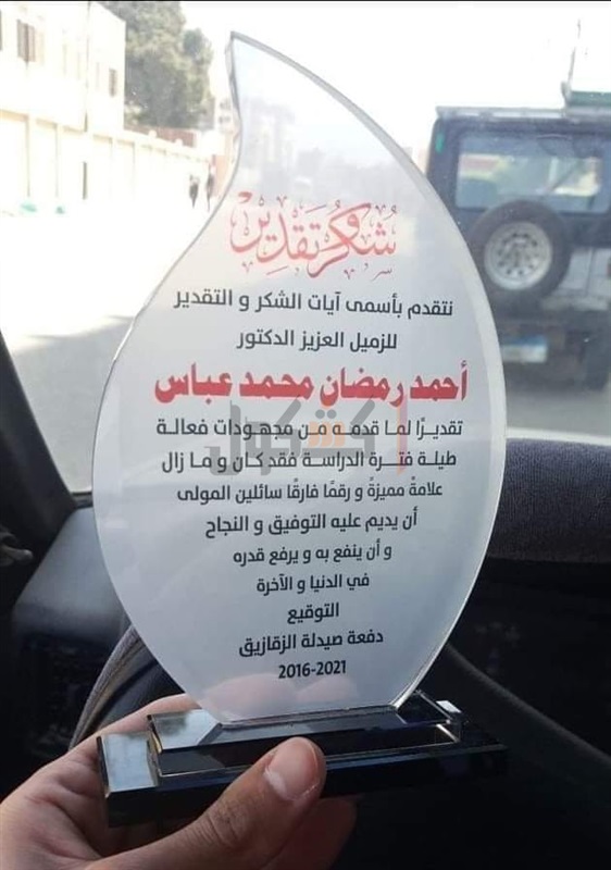 شهدت كلية صيدلة جامعة الزقازيق احتفال طلاب الدفعة الخامسة "دفعة 43"، بمناسبة انتهاء امتحانات الفصل الدراسي الثاني للعام الجامعي 2020/2021، حيث قام الطلاب بعمل ممر شرفي للطالب أحمد رمضان تقديرًا لجهوده ومساعدته لزملائه في الدفعة طوال أيام الدراسة.