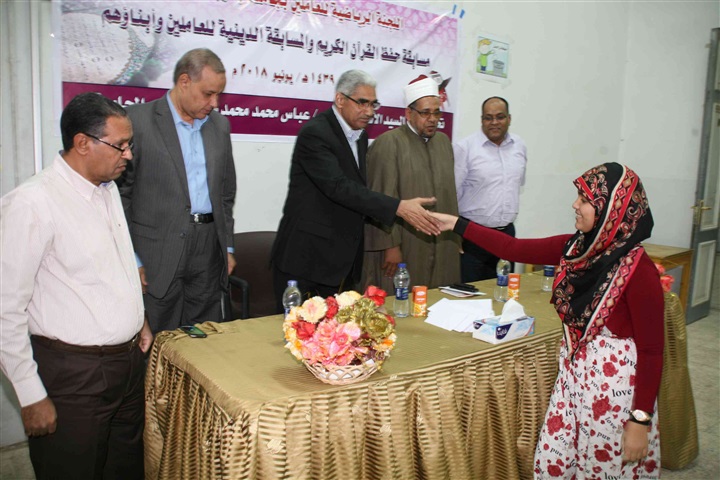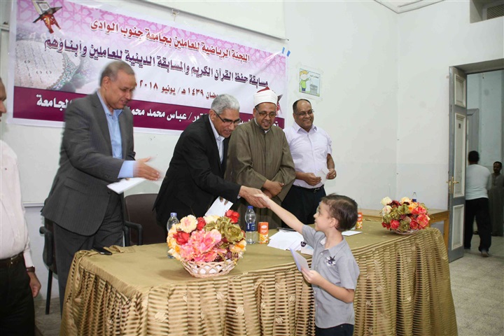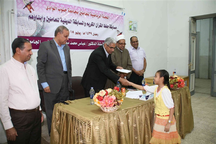 قام الدكتور عباس منصور رئيس جامعة جنوب الوادي بقنا، بتسليم جوائز الفائزين في مسابقة القران الكريم والتي نظمتها اللجنة الرياضية للعاملين وأبنائهم بمناسبة شهر رمضان المعظم في مسابقة أبناء العاملين في حفظ القرآن الكريم كاملاً، حيث فازت فاطمة عاصم السيد بالمركز الأول.