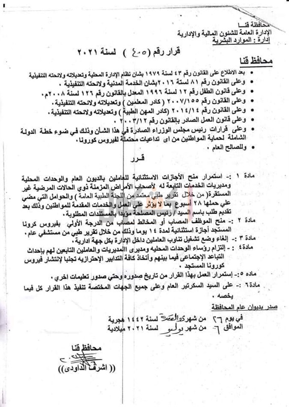قررت محافظة قنا، استمرار منح الأجازات الاستثنائية للعاملين بالديوان