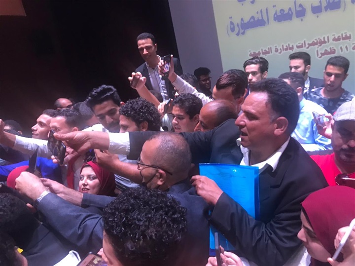 رئيس جامعة المنصورة بالتصفيق الحاد فور دخول أعضاء الوفد، وهتف الطلاب المشاركين فى