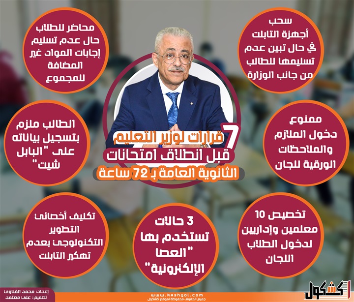 7 قرارات لـ«شوقي» قبل انطلاق امتحانات الثانوية العامة بـ 72 ساعة.. انفوجراف
