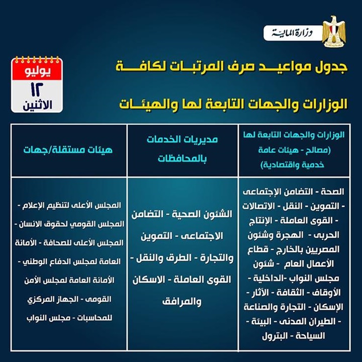 ومن حانبها نشرت وزارة المالية جدول مواعيد صرف مرتبات شهر يوليو الجاري، حسب الوزارة والجهة التابع لها الموظف، كالتالي:.