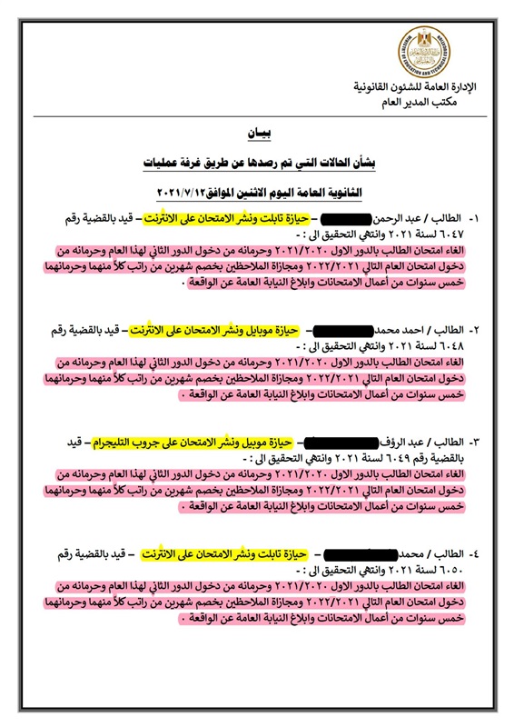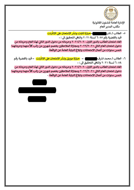 - الطالب "ع.ا.ش" بإدارة طنطا بمحافظة الغربية نظرًا لحيازته موبايل ونشر الامتحان