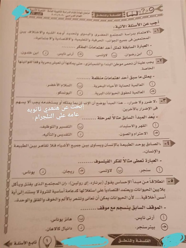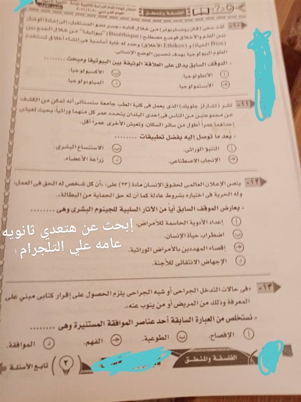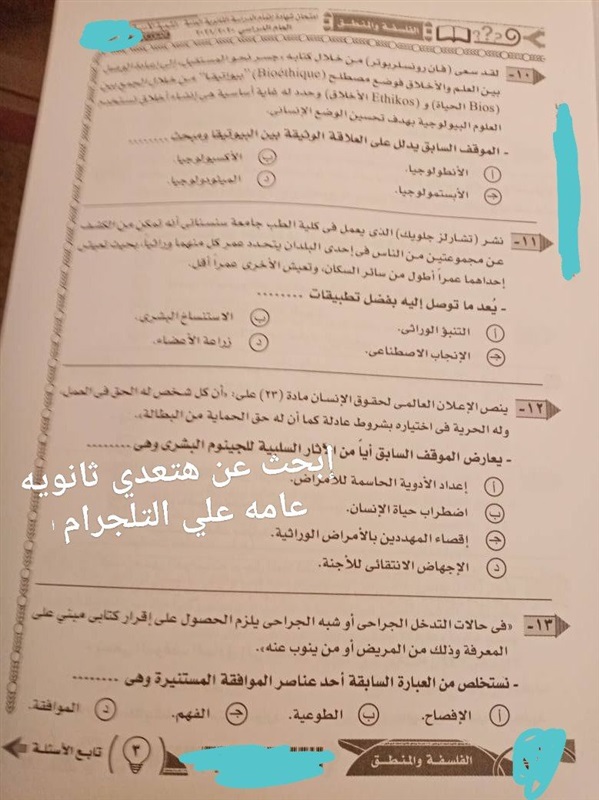 تداولت صفحات ومجموعات الغش الإلكتروني على موقع التواصل الاجتماعي تليجرام، صور لأسئلة امتحان الفلسفة والمنطق لطلاب الشعبة الأدبية.
