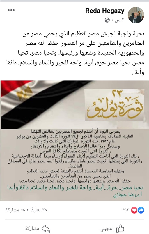 وقال الدكتور رضا حجازي، في منشور عبر صفحته الرسمية على موقع التواصل الاجتماعي" فيسبوك": " تحية واجبة لجيش مصر العظيم الذي يحمي مصر من المتآمرين والطامعين علي مر العصور حفظ الله مصر والجمهورية الجديدة وشعبها ورئيسها. وتحيا مصر. تحيا مصر. تحيا مصر حرة، أبية، واحة للخير والنماء والسلام، دائمًا وأبدًا".