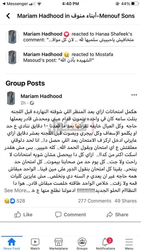 عبرت زميلة الطالبة منار التي توفيت اليوم داخل لجنة امتحان الفيزياء، عن حزنها، بمنشور علي الفيس بوك قالت :" هكمل امتحانات ازاي بعد المنظر اللي شوفته النهارده قبل اللجنه بثلث ساعه كان في واحده بتموت قدام عيني ومحدش قادر يعملها حاجه وكل العيال خايفه تقربلها بعد ما قعدنا ١٠ دقايق ننادي علي حد او يكلمو الإسعاف وكل بيجري ويصوت قبل اللجنه بعشر دقايق ازاي عايزني ادخل اركز ف الامتحان بعد اللي حصل دا ".