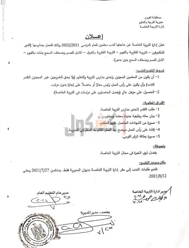 وذلك للعمل بمدارسها "النور للمكفوفين_ التربية الفكرية _ الأمل للصم وضعاف