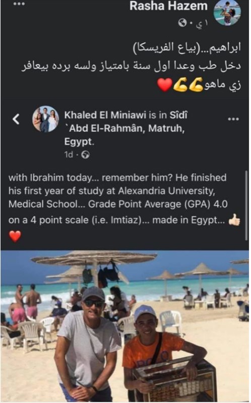 تداول رواد موقع التواصل الاجتماعي فيسبوك منشور تحت اسم «شوفوا بياع الفريسكا بعد سنة» للطالب إبراهيم عبد الناصر بائع الفريسكا، والذي ذاع صيته العام الماضي بعد أن تم تصوير فيديو له على أحد شواطئ الساحل الشمالي وهو يبيع الفريسكا ليخبر مصور الفيديو أنه التحق بكلية الطب بجامعة الإسكندرية.