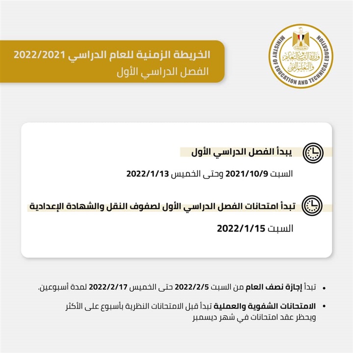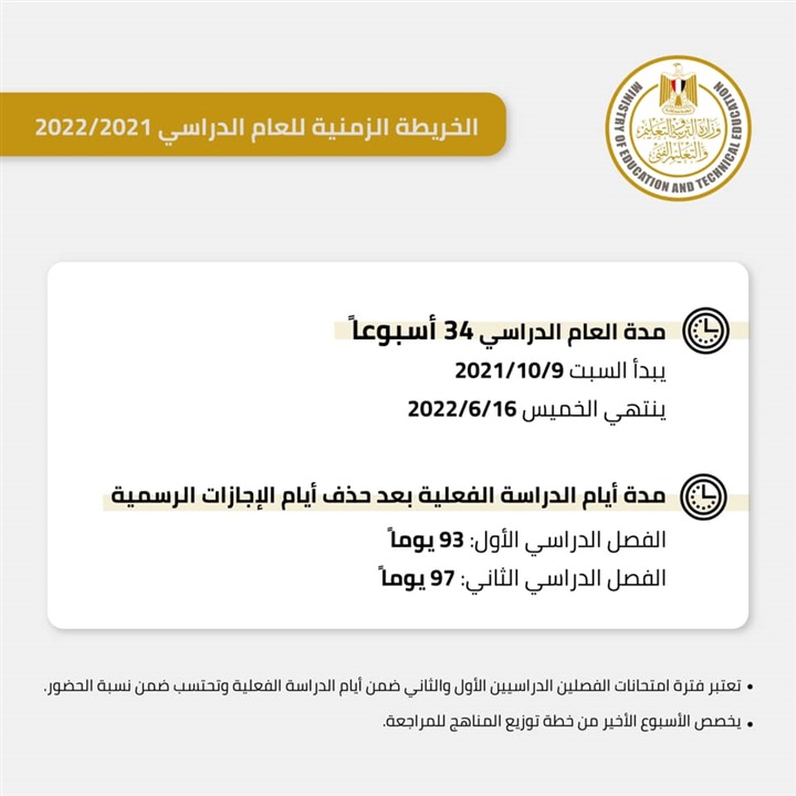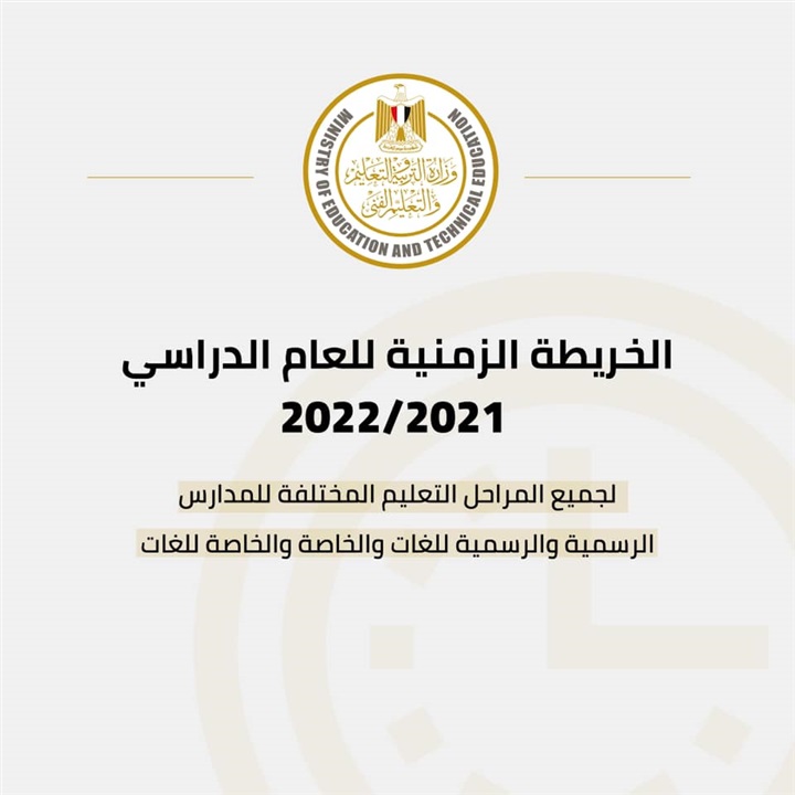 أعلنت وزارة التربية والتعليم والتعليم الفني عن الخريطة الزمنية للعام الدراسي ٢٠٢١/ ٢٠٢٢ لجميع مراحل التعليم المختلفة للمدارس الرسمية والرسمية للغات والخاصة والخاصة للغات.