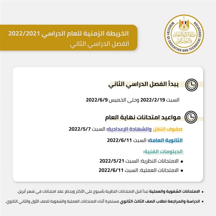 السبت ١١/ ٦/ ٢٠٢٢ والامتحانات النظرية للدبلومات الفنية يوم السبت ٢١/ ٥/ ٢٠٢٢ أما