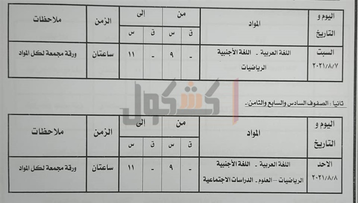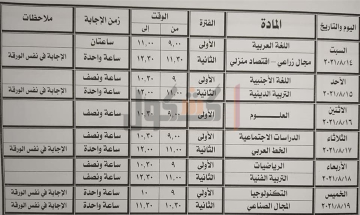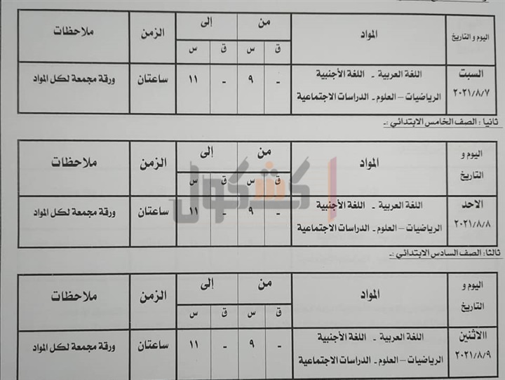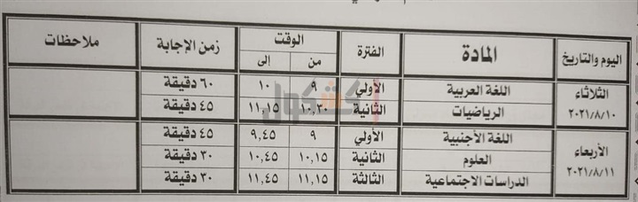 للعام الدراسي 2020/2021 ، والتي تشمل امتحانات النقل للطلاب من الصف الرابع الابتدائي وحتى الصف الثاني