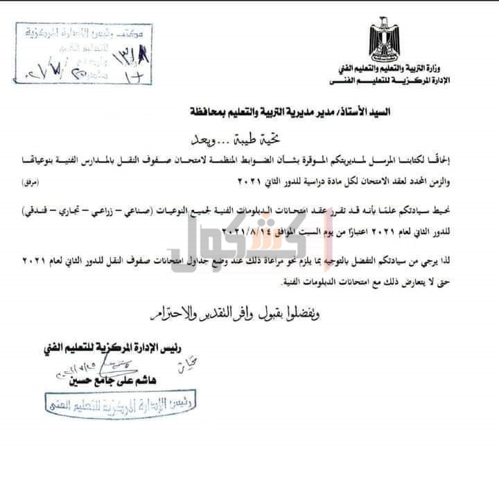 انه الحاقا لكتابنا المرسل لمديريتكم الموقرة بشان الضوابط المظمة لامتحان صفوف النقل بالمدارس الفنية بنوعياتها ، والزمن المحدد لعقد الامتحان لكل مادة دراسية للدور الثاني ۲۰۲۱، نحیط سيادتكم علما بأنه قد تقر ر عقد امتحانات الدبلومات الفنية لجميع النوعيات (صناعي - زراعي - تجاري - فندقي)للدور الثاني لعام ۲۰۲۱ اعتبارا من يوم السبت الموافق ۲۰۲۱/۸/١٤ ، لذا يرجي من سيادتكم التفضل بالتوجيه بما يلزم نحو مراعاة ذلك عند وضع جداول امتحانات صفوف النقل للدور الثاني لعام ۲۰۲۱