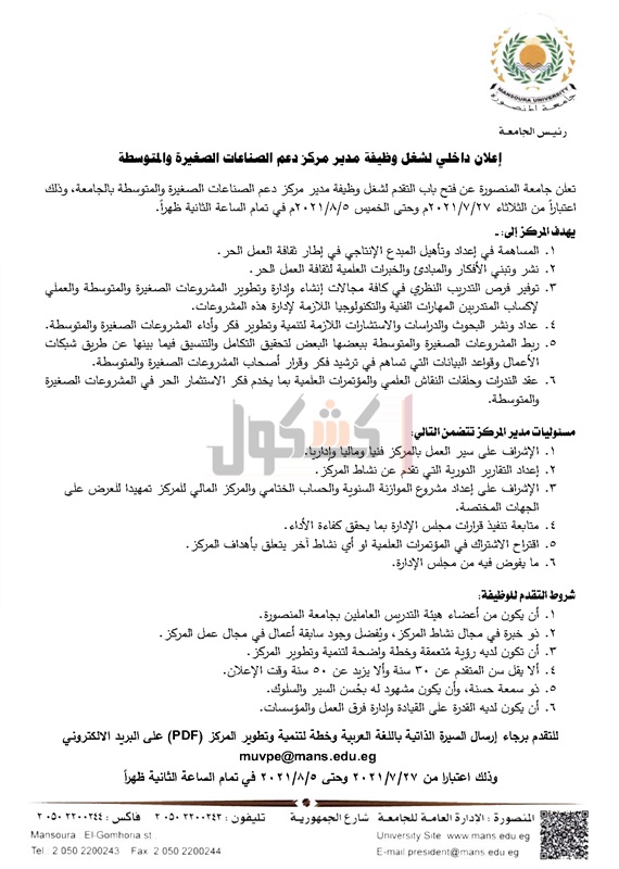 أعلنت جامعة المنصورة فتح باب التقدم لشغل وظيفة مدير مركز دعم الصناعات الصغيرة والمتوسطة بالجامعة، وذلك اعتبارا من يوم غد الثلاثاء ۲۰۲۱/۷/۲۷ م وحتى يوم الخميس 5/8/2021 م في تمام الساعة الثانية ظهرة.