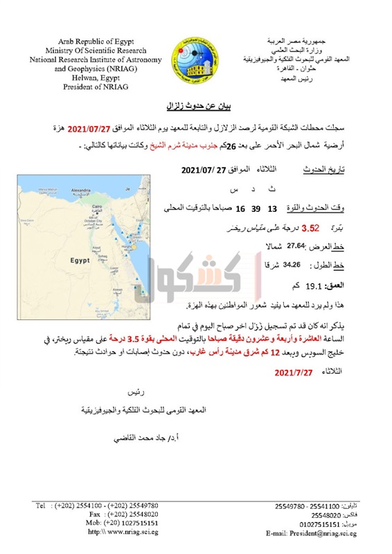 أعلن الدكتور جاد محمد القاضي، رئيس المعهد القومي للبحوث الفلكية والجيوفيزيقية، أن محطات الشبكة القومية لرصد الزلازل والتابعة للمعهد، سجلت اليوم الثلاثاء الموافق 27/07/2021، هزة أرضية شمال البحر الأحمر على بعد 26 كم جنوب مدينة شرم الشيخ وكانت بياناتها كالتالي: