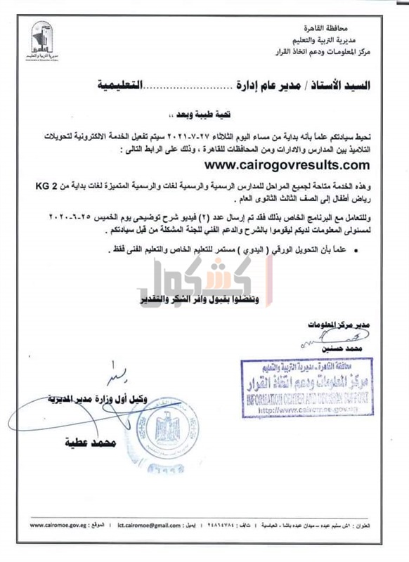 ونص المستند على الأتي : " نحيطكم علما بأنه بداية من مساء اليوم الثلاثاء ۲۷-۷-۲۰۲۱ سيتم تفعيل الخدمة الالكترونية لتحويلات التلاميذ بين المدارس والإدارات ومن المحافظات للقاهرة ، وذلك على الرابط التالى :