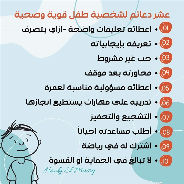 وكتبت" المصري" منشور عبر صفحتها الرسمية على موقع التواصل الاجتماعي" فيسبوك"، هناك 10 دعائم لشخصية طفل قوية وصحية، وهم: