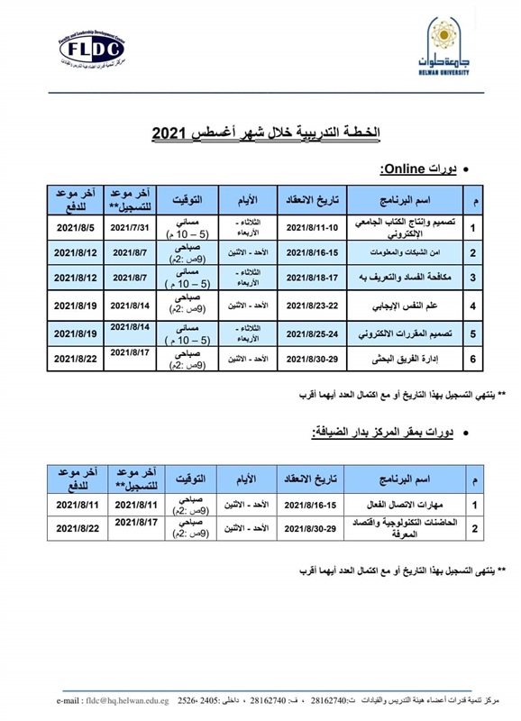 الخطة التدريبية لمركز تنمية قدرات أعضاء هيئة التدريس بجامعة حلوان خلال شهر أغسطس