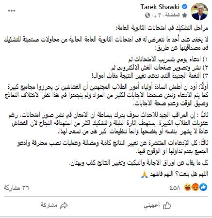 قائلا "كل ما يقال عن اوراق الاجابة والتيكيت وتغيير النتائج كذب وبهتان، اللهم