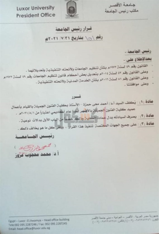 أصدر الدكتور محمد محجوب عزوز رئيس جامعة الأقصر، قرار بتعيين الدكتور أحمد محيى حمزة الأستاذ بقسم الجرافيك عميداً لكلية الفنون الجميلة.