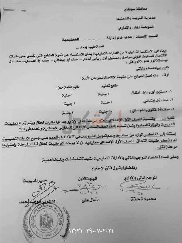 _ صف أول ابتدائي طابع تعليمي 10 جنيهات، وطابع نقابة مهن تعليمية 1 جنية