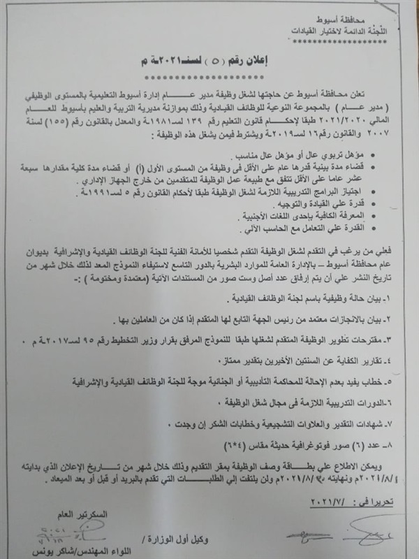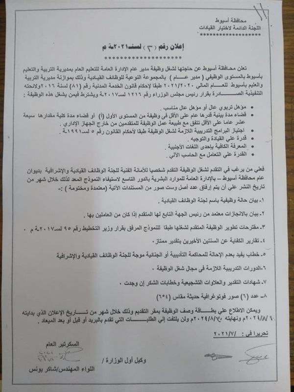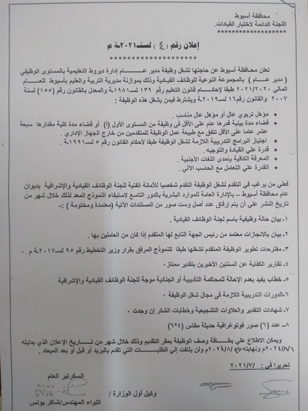 وأضاف محافظ أسيوط أن الوظائف القيادية التي تم الإعلان عنها تتضمن لـ (مدير عام الإدارة العامة للتعليم العام ، مدير عام إدارة أسيوط التعليمية ، مدير عام إدارة ديروط التعليمية ، مدير عام الإدارة العامة للخدمات) وذلك بموازنة مديرية التربية والتعليم بأسيوط للعام المالي2020/2021 لافتاً إلى فحص أوراق المتقدمين والمفاضلة بينهم سيتم عن طريق لجنة متخصصة للتأكد من مدى مطابقتهم للشروط بكل دقة وحيادية مؤكداً على عدم الالتفات للطلبات التي تقدم بالبريد أو قبل أو بعد الميعاد المحدد (خلال شهر من تاريخ الاعلان) الذي يبدأ من 1 أغسطس الجاري ونهايته 30 أغسطس 2021.
