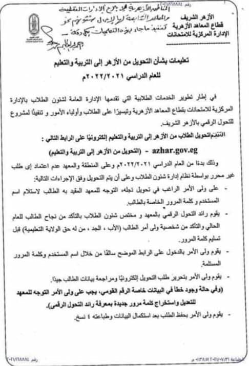 تعليمات التحويل والنقل من المعاهد الأزهرية للمدارس 2021- 2022