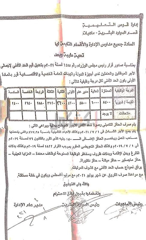 للعاملين بالتعليم.. تعليمات تعديل قيمة الحد الادني لإجمالي الأجر "مستند"