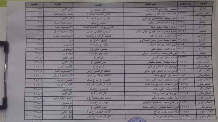 علي نفس الدرجات منهم الـ9 الأوائل حصلوا علي 279 درجة من مجموع كلي 280