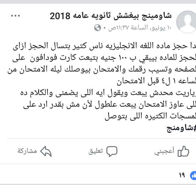 بدء "شاومينج بيغشش ثانوية عامة" في تلقي طلبات حجز امتحان اللغة الإنجليزية أمس، حيث كتب عبر صفحته أنه سينتهى حجز مادة اللغة الإنجليزية مساء اليوم، متوعدا بإرسال الامتحان للطلاب الحاجزين من الساعه الواحدة حتى الرابعة صباحا.