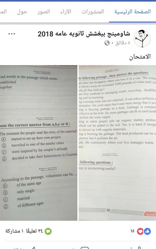 نشرت صفحة "شاومينج بيغشش ثانوية عامة"، امتحان اللغة الأجنبية الأولي "الإنجليزية" عبر صفحته قبل مرور 20 دقيقة علي بدء اللجان.