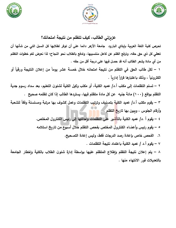 أعلنت كلية اللغة العربية بجامعة الأزهر بإيتاي البارود، فتح باب التظلم على نتيجة الفصل الدراسي الثاني، للعام الجامعي 2019\2020، لطلاب وطالبات الفرق.