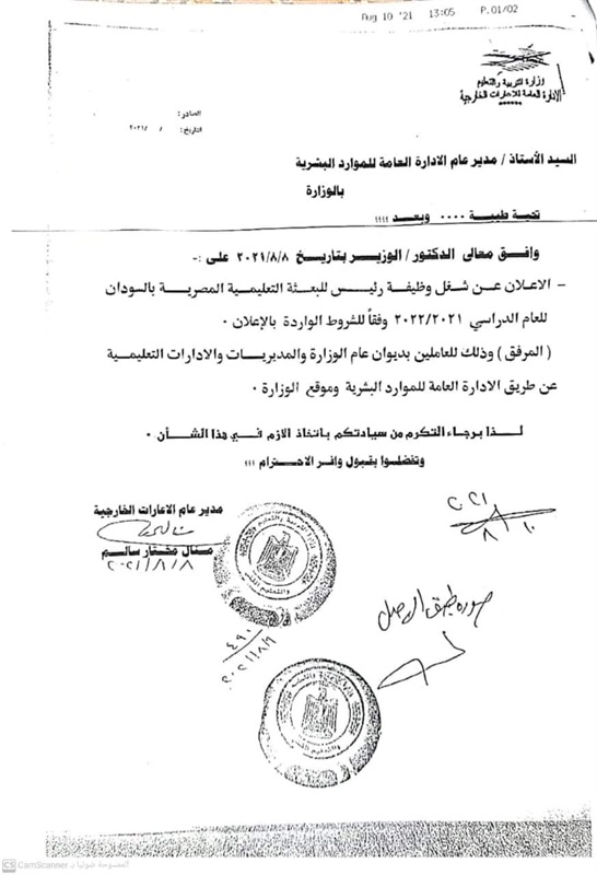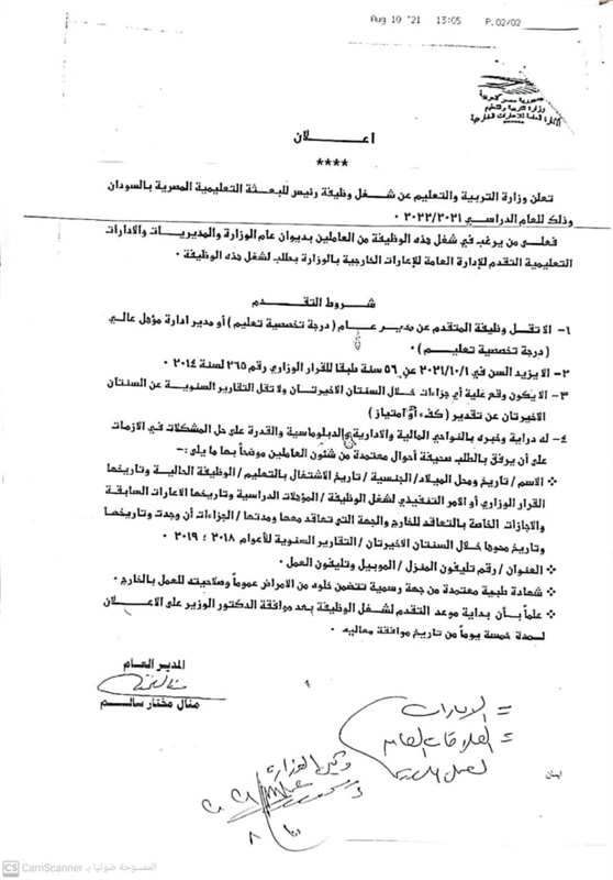 التعليم تعلن فتح باب التقديم لشغل وظيفة رئيس البعثة التعليمية المصرية في السودان