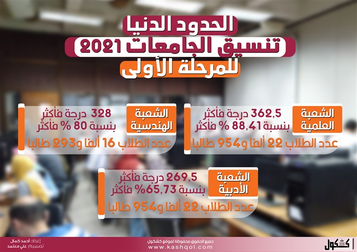 جراف انفوجراف.. الحدود الدنيا لتنسيق الجامعات المرحلة الأولى أحمد كمال الثلاثاء 17/أغسطس/2021 - 06:33 م 8/17/2021 6:33:00 PM طباعة facebook twitter whats شارك تنسيق الجامعات المرحلة الاولى الحدود الدنيا الجامعات التنسيق
