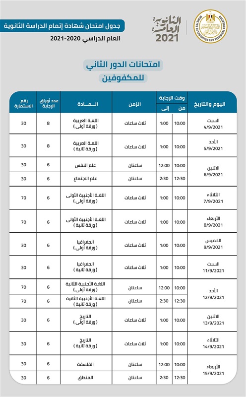 نشرت وزارة التربية والتعليم والتعليم الفني، جدول امتحانات الدور الثاني للمكفوفين للعام الدراسي ٢٠٢٠-٢٠٢١.