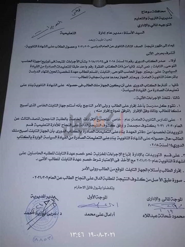 وجهت وزارة التربية والتعليم والتعليم الفني، المديريات التعليمية بإتخاذ إجراءات جديدة بشأن اجهزة التابلت الخاصة بالطلاب الحاصلين على شهادة الثانوية العامة للعام الدراسي 2020_ 2021.