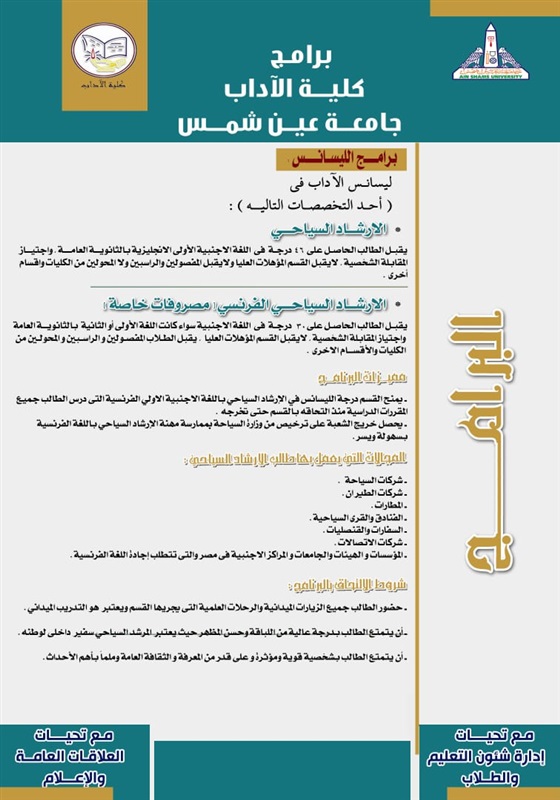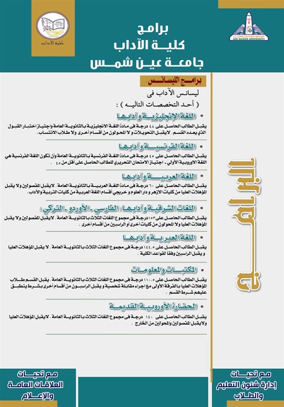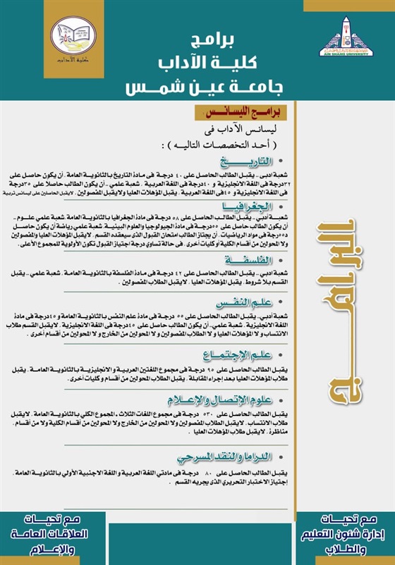أعلنت كلية الآداب بجامعة عين شمس، شروط التسجيل ببرامجها الدراسية وكذلك