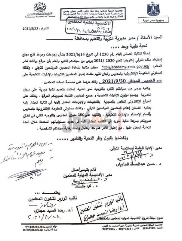 وشددت على المديريات التعليمية ضرورة التنبيه بتعميم نشرة دورية على ديوان المديرية وجميع الإدارات التعليميةوالمدارس، لمتابعة الموقع الإلكتروني الخاص بالمديرية، واتخاذ الاجراءات اللازمة للترقي.