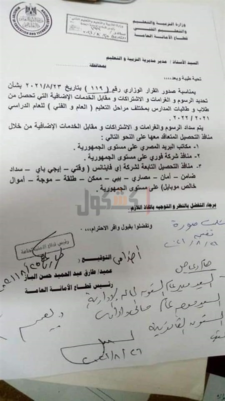 وجهت وزارة التربية والتعليم، خطاب للمديريات التعليمية، بمناسبة صدور القرار الوزاري رقم 119 بتاريخ 23 أغسطس 2021 بشأن تحديد رسوم الغرامات والاشتراكات ومقابل الخدمات الإضافية التي تحصل من الطلاب بالمدارس بمختلف مراحل التعليم العام والفني للعام الدراسي 2021_ 2022.