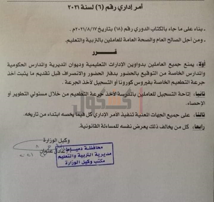 وأصدرت الوزارة أمر إداري رقم ( ٦) لسنة ٢٠٢١ ، وجهت فيه بتنفيذ الآتي: