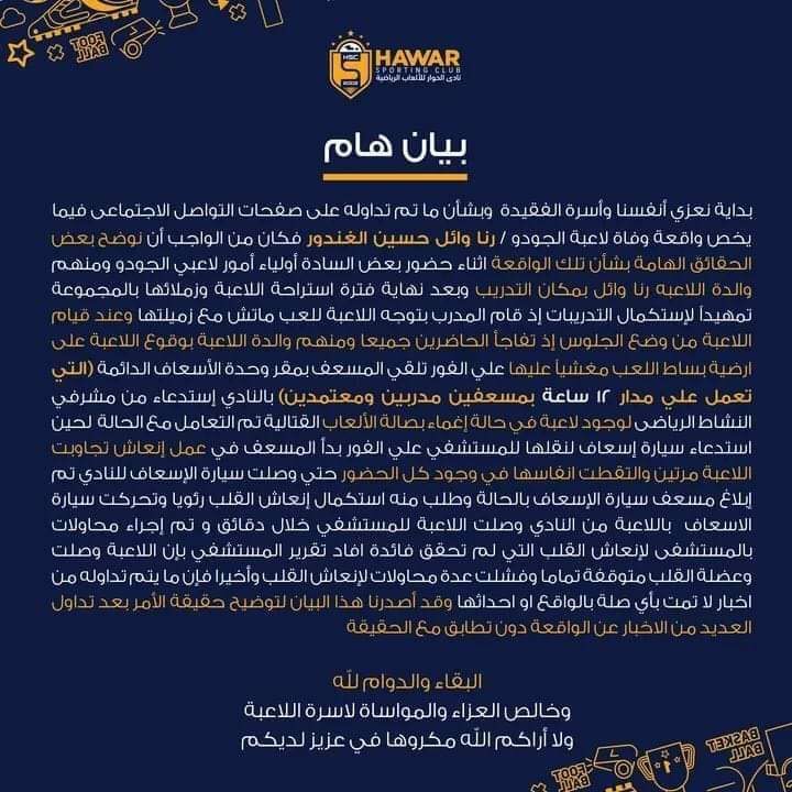 صفحات التواصل الاجتماعي فيما يخص واقعة وفاة لاعبة الجودو/ رنا وائل حسين
