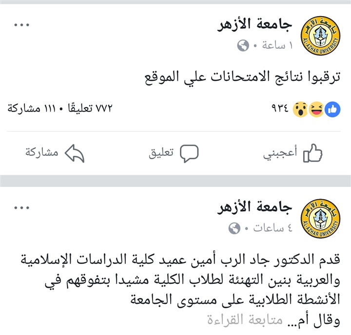 أدمن صفحة جامعة الأزهر الرئيسية على "فيسبوك"، تقربوا نتائج الامتحانات