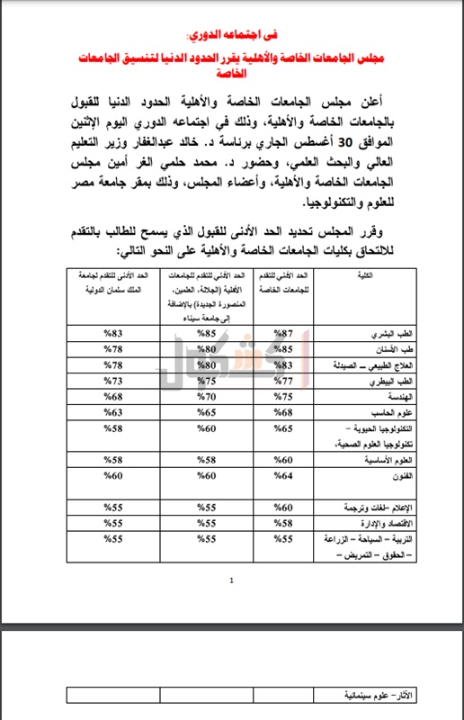 تنسيق الكليات الخاصة 2021 الحد الأدنى للتقدم للجامعات الخاصة